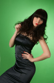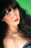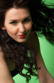 Fotografia studyjna z portfolio modelu. Brunetka kręcone włosy. duży portret w wolnym stylu, zdjęcie pełnowymiarowe, zdjęcie mody (seksowne)