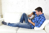 młody przystojny mężczyzna z pilotem zdalnego sterowania