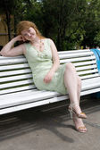 mooi doordachte meisje, zittend op een bankjepiękna dziewczyna zadumany, siedząc na ławce w parku