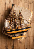 Stary papier, kompas, liny i model klasyczny łodzi na tle drewna
