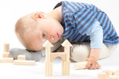 mały ładny chłopiec bawi się budulcem. na białym tle.