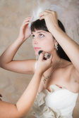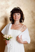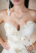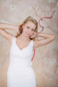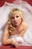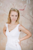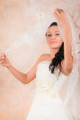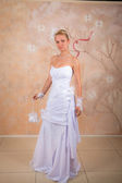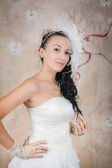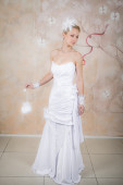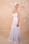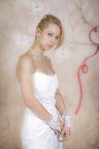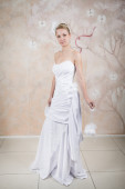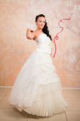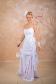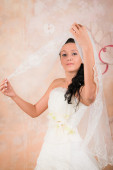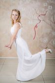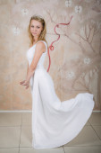 piękna panna młoda zgrabna w elegancka suknia ślubna na kolorowym tle. Fotografia ślubna.