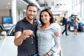 Młoda atrakcyjna para stojący samochodem za pomocą klawiszy