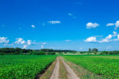 zielone pola, drogi, lasu, na tle niebieski niebo z chmurami