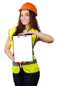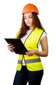 Młoda dziewczyna konstruktora w kask i kamizelka z poziomu w ręce
