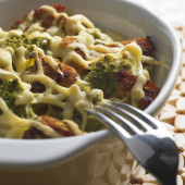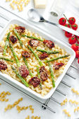 makaron pieczony z suszonymi pomidorami, serem pecorino i szparagami