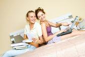 szczęśliwy dziewcząt brunette z laptopa na dnie w domu