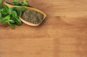 domowe szparagi z przyprawami i ziołami na drewnianym tle