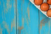 jaja w pudełku na niebieskim drewnianym tle. Widok z góry. wolne miejsce na tekst.
