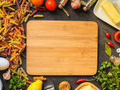 top view ingredients for pasta, spices, herbs, vegetables
