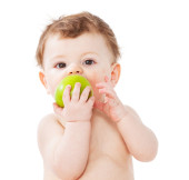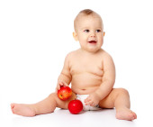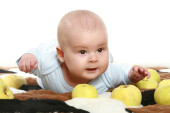 ładny mały chłopiec bawi się z kilku jabłka żółty siedząc na podłodze, na białym tle nad białym