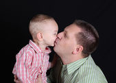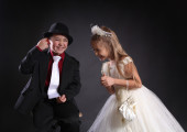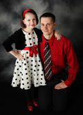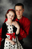 dziewczynka trzyma rękę jej tata patrząc na niego adoringly, na sobie sukienkę czerwone i czarne kropki