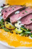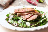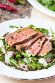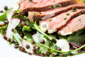 Sałatka z stek wołowy z grilla, czarna soczewica, rakiety, rzodkiewka, cu