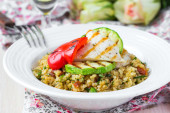 kuskus z sosem pesto, smażone plastry wieprzowiny, smaczne danie