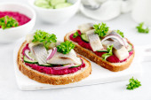 Zdjęcie "Canape śledzia z buraków na żyta toast, smaczne rozrusznik, appertise" może być wykorzystywane do celów osobistych i komercyjnych zgodnie z warunkami zakupionej licencji Royalty-free. Obraz jest dostępny do pobrania w jakości wysokiej rozdzielczości do 5760x3840.