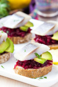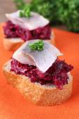 Canape śledzia z buraków na żyta toast, smaczne rozrusznik, appertise