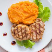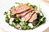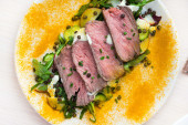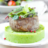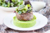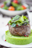 stek wołowy z grilla, zielone puree z grochu, zioła, smak