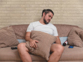 Pijany mężczyzna zemdlał na kanapie z butelką piwa w kanapie..