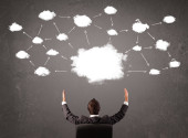 Biznes człowiek w garniturze patrząc na chmurę z spadających pieniędzy