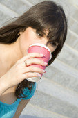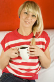Młoda kobieta z pomarańczowy filiżankę herbaty / kawy