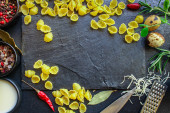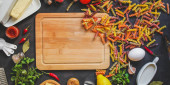 makaron, warzywa, zioła, przyprawy, gotowanie, jedzenie, kuchnia, kulinarny, przepis, widok z góry