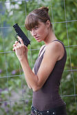 młoda kobieta w obcisłe czarne spodnie pozowanie z dwóch pistoletów na szarym tle