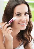 uśmiechnięta kobieta stosowania korektora na twarz, na białym tle