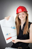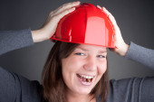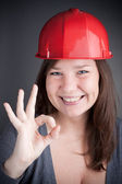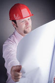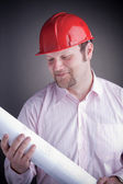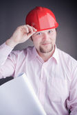 portret młodego architekta noszenie czerwony kask, patrząc na kamery