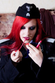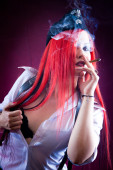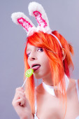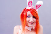 kobieta Zajączek na szarym tle z włosów pomarańczowy