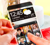 smartphone rezygnować przeźroczysty ekran w ludzkich rąk.