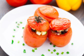 pieczone dojrzałe pomidory wypełnione jajami i zielonych. makro