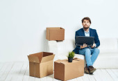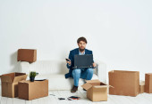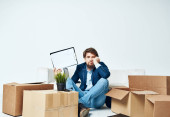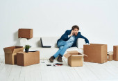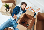 Mężczyzna w garniturach z rzeczami komunikującymi się w biurze telefonicznym rozpakowuje