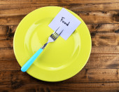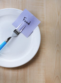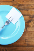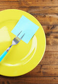 papier firmowy z wiadomości dołączone do stołu, na talerzu, drewniane tła kolor