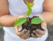Dziecko z ojcem zasadziło ogród dziecięcy. Wybiórcze skupienie. ludzie.