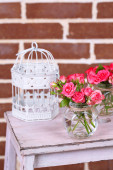 Piękne różowe tulipany na szarym tle ściany