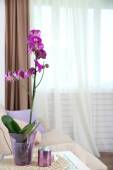 Piękne wiosenne kwiaty w wazonie na tle wnętrza domu