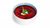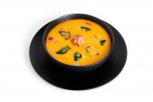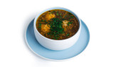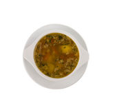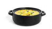 Zupa z klopsikami w czarnym garnku odizolowany na białym tle.