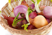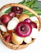 różnych surowej cebuli na drewniane tła