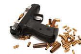 Zbliżenie pistoletu, celu i nabojów jest izolowane na białym tle.
