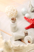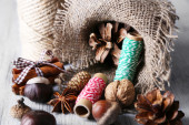 Kompozycja z naturalnego pumeksu, wątek, cynamon laski na drewniane tła