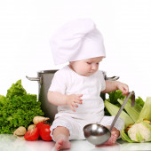 portret dziecka siedzi sobie kapelusz kucharz siedzi w środku i lizanie duże gotowanie puli zasobów, otoczony warzywa i jedzenie, na białym tle