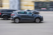 Ukraina, Kijów - 18 marca 2021 r.: Szary samochód Toyota RAV 4 poruszający się po ulicy.