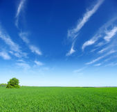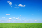 pola - zielona trawa, Błękitne niebo i białe chmury