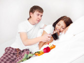 młody mężczyzna całuje swoją piękną dziewczyną i dając jej różę