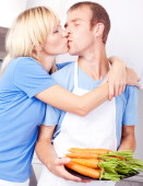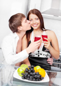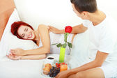 młody człowiek przynosi jego dziewczyna róży i kawy w łóżku