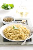 makaron spaghetti z pesto na talerzu, selektywne focus