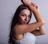 portret modne młoda kobieta w funky niebieska koszula poza szarym tle