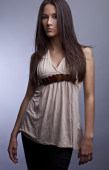portret modne młoda kobieta w funky niebieska koszula poza szarym tle