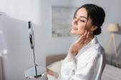 uśmiechnięta panna młoda w białym szlafroku naprawiająca włosy w pobliżu lustra i szampana na stoliku nocnym
