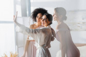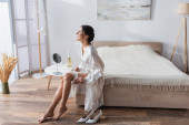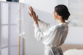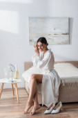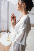 boso panna młoda w białym jedwabnym szlafroku utrwalanie włosów w sypialni